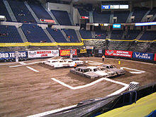 Monster truck shows typically have two main events, a race and a freestyle competition. Races are conducted as a single-elimination tournament on short, symmetrical tracks, which may include obstacles such as junk cars or dirt mounds. The length and complexity of the track can vary with the size of the venue, with courses in indoor arenas typically being shorter with fewer obstacles.