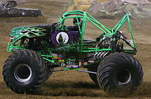 A monster truck is a specialized truck with a heavy duty suspension, four-wheel steering, and oversized tires constructed for competition and entertainment uses. Originally created by modifying stock pickup trucks and sport utility vehicles (SUVs), they have evolved into purpose-built vehicles with tube-frame chassis and fiberglass bodies rather than metal. A competition monster truck is typically 12 feet (3.7 m) tall, and equipped with 66-inch (1.7 m) off-road tires.