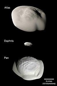 Shepherd satellites are small moons that orbit within, or just beyond, a planet's ring system. They have the effect of sculpting the rings: giving them sharp edges, and creating gaps between them. Saturn's shepherd moons are Pan (Encke gap), Daphnis (Keeler gap), Atlas (A Ring), Prometheus (F Ring) and Pandora (F Ring).[21][25] These moons together with co-orbitals (see below) probably formed as a result of accretion of the friable ring material on preexisting denser cores. The cores with sizes from one-third to one-half the present-day moons may be themselves collisional shards formed when a parental satellite of the rings disintegrated.[41]