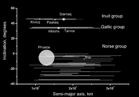 The remaining 58, with mean diameters ranging from 4 to 213 km, are irregular satellites, whose orbits are much farther from Saturn, have high inclinations, and are mixed between prograde and retrograde. These moons are probably captured minor planets, or debris from the breakup of such bodies after they were captured, creating collisional families. The irregular satellites have been classified by their orbital characteristics into the Inuit, Norse, and Gallic groups, and their names are chosen from the corresponding mythologies. The largest of the irregular moons is Phoebe, the ninth moon of Saturn, discovered at the end of the 19th century.