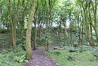 - Dalmellington Moat Hill (NS 482 058). Dalmellington's mound is 154 paces in circumference at the base, surrounded by a ditch, 9 feet (3 m) broad at the bottom, and 4 feet (1 m) deep. Measured from the bottom of this ditch, the mound is 28 feet (9 m) high; the top is 22 paces in diameter, the sides are very steep. A wooden stairs was fitted to the top in Smith's time (1890s).[29] He records that it may have been a fort at one time as well as being used as a moot hill later. A Gillies Knowe, possibly a corruption of Gallows Knowe, is nearby.[51] 55°19′22″N 4°23′38″W / 55.3228°N 4.394°W