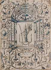 Another, related, meaning was defined in 1611 by Randle Cotgrave's A Dictionarie of the French and English Tongues as: "a rude or anticke painting, or carving, wherin the feet and tayles of beasts, &c, are intermingled with, or made to resemble, a kind of wild leaves, &c." [1] The word was also used for such a figure, starting off as a human or animal, but terminating as part of a decorative scheme of foliage or geometric strapwork.