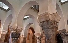Built in 999 in Toledo, this building is a rarity in that it is in much the same state as it was when it was originally built.[1] The building is a small square structure. It measures roughly 8 m × 8 m. Four columns capped with Visigothic capitals divide the interior into nine compartments. Covering each of these bays is a vault that has a distinctive design that is unique unto itself. The central vault is higher than the other ones and acts as a cupola for the structure. Each vault employs the use of ribs to create the designs that make them unique. Each of them follows the basic ideas of Islamic design. The ribs typically do not cross in the center, an idea that is seen in many Muslim designs. Some of the designs are more rectilinear while others embrace the curved forms of the vault more prominently. Within each one is a piece of their culture and tradition of building.[1] The columns and the capitals both had been taken from previous buildings and are therefore known as spolia. The building is constructed of brick and small stones. These techniques are a reflection of both the local building tradition as well as the influence from the caliphate in Córdoba. The influence of the caliphate can be seen in the brickwork on the facade of the building which resembles those seen at the Cathedral–Mosque of Córdoba. Both Mosque of Cristo de la Luz with Cathedral–Mosque of Córdoba are the oldest examples of the islamic culture at Spain.[2] Originally the Eastern wall was a continuous stretch of brick and served as the qibla wall for the mosque. Also located along this side would have been a mihrab used for worship. The other three facades are articulated by three-bay arcades. All are similar, but individual in their decoration.[3] The Western wall which served as the main entrance is unique in how the arcade is articulated. This facade has a lobed arch, horseshoe arch, and a wider version of a horseshoe arch. Brickwork arches provide the decoration for the facade which are influenced by the architecture in Córdoba. In later years a Mudejar semi-circular apse was added. In the process of the addition the qibla wall and mihrab were lost. The use of the mudejar style provided a smooth transition from the original structure to the apse, as the addition uses the same style of decoration and materials as the original. The continuation of the arch motif isanimportant link between the two sections of the building.[4]