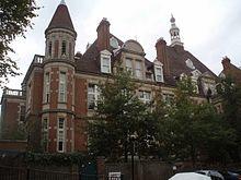 The hospital was founded as The North London Hospital for Consumption and Diseases of the Chest in a mansion in Hampstead High Street in 1860.[1] A central London out-patients department opened in the Tottenham Court Road in 1861.[1] In October 1880 Prince Arthur, Duke of Connaught and Strathearn laid the foundation stone for a purpose-built hospital at Mount Vernon in Hampstead. The hospital, which was built in the French Renaissance style, was completed in 1881.[2] The adjacent Mount Vernon House served as the residence of the Hospital Seceretary and from 1903 as the hospital's Nurses' Home.[2] Meanwhile the Central London out-patients department moved from Tottenham Court Road to Fitzroy Square in 1891.[2]