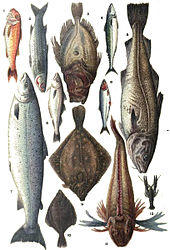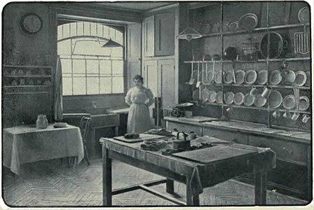 The 1907 edition runs to some 30 full-page colour plates, and over 100 full-page illustrations in monochrome. These include photographs, such as of the housekeeper standing with hands behind her back in her kitchen (pictured), facing the first page of Chapter 2, "The Housekeeper". An idea of the amount of detail may be gained from the fact that there are 11 illustrations of types of fish (one pictured), such as "steamed sole" and "soused mackerel", and another of "fish entrées".[43]