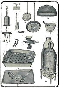 The book begins with general chapters on the duties of the "mistress", the housekeeper, and the cook. There follow chapters on the kitchen itself, "marketing" (choosing good-quality produce at the market), and an introduction to cookery (Chapter 6).[16] Together, these take up over 100 pages. Chapters 7 to 38 (roughly 1000 pages) cover English cooking, with recipes for soups, gravies, fish, meat (principally veal, beef, mutton and lamb, and pork), poultry, game, preserves, vegetables, pastries, puddings, sweets, jams, pickles, and savouries.[17] Chapter 39 describes the "art of carving at table", supported by 11 illustrations.[18] Chapters 40 to 50 (some 200 pages) give instructions for dairy products, vegetarian and invalid (sick person) cookery, making bread, biscuits and cakes, and beverages.[19] Chapters 51 to 59 describe cooking in various international styles including French, German, Spanish, Jewish, Australian, South African, Indian, American and Canadian cookery.[20] Chapters 60 to 68 provide guidance on matters from trussing poultry to the definitions of culinary terms, arranging meals, decorating the table, making menus and the duties of domestic servants.[21] Chapters 69 to 73 describe "household recipes" and medical preparations.[22] The final chapter, 74, offers "legal memoranda".[23]