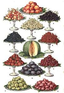 Another full-page colour plate (pictured) showed a variety of fruits including apricots, white and black cherries, white, red and black currants, a melon, strawberries and varieties of plums, all piled high on circular dishes or fruit stands.[43]