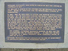 Buchanan made several explorations inland from Bowen Downs, including securing land near Burketown, Queensland. In October 1877, with a companion, Sam Croker, Buchanan began to investigate the country from the known regions round the Rankine to the overland telegraph line, around 800 kilometres (500 mi) away. They discovered much good new land, part of the Barkly Tableland, and has since carried some of the largest herds in Australia. Throughout the 1870s and 1880s Buchanan did a large amount of pioneering, working principally in northern Queensland and the Northern Territory. Buchanan was also noted for his overlanding feats including droving 20,000 head of cattle from Queensland to Glencoe Station.[5] He had another property, Wave Hill, for a period, but he lost this in 1894 on account of a great fall in cattle prices and the difficulty in getting markets. His son, Gordon Buchanan, had taken up land at Flora valley in 1887 and Buchanan now established this as his headquarters. About two years later, with another man and an aboriginal boy, he started with camels and equipment provided by the South Australian government to find a stock route from northern Queensland. He went from Oodnadatta up the line to Tennant Creek, and then westward to Sturt's Creek. About 64 kilometres (40 mi) from Hooker's Creek he sighted the hills now named Buchanan Hills, and next day came to a branch of Hooker's Creek. Then he went to Hale's Creek and the Sturt, and then to Flora valley. Attempts were made to find a practicable stock route to the west with no success. Returning to Flora Creek he prepared a report for the South Australian government which added much to the knowledge of the country, though Buchanan had failed in his main object. In 1899 Buchanan, now 73 years of age, bought a farm on Dungowan Creek, 35 kilometres (22 mi) from Tamworth and he died there in 1901 still working. Nat was buried in the general cemetery at Walcha, New South Wales. He married in 1863 Catherine Gordon who survived him, along with a son.