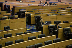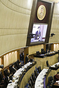The Government of Thailand, particularly the Cabinet of Thailand is answerable directly to the National Assembly. The constitution mandates that within 15 days of being sworn-in, the Cabinet must state its policies to the National Assembly.[14] The National Assembly has the authority to call any minister to appear before it at any time to explain policies or answer questions. This power of scrutiny is important as some members of the Cabinet need not be members of the National Assembly. If they are a member, they can only be from the lower house or the House of Representatives, as the constitution expressly forbidden members of the Senate from being members of the Cabinet.[15]