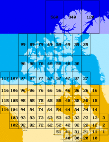 The National Topographic System is split into three major "zones", each spanning a different range of latitudes. The "Southern zone" covers latitudes between 40°N and 68°N, the "Arctic zone" covers latitudes between 68°N and 80°N, and the "High Arctic zone" covers latitudes between 80°N and 88°N.