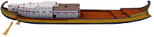 The hull was divided into three "active" or main sections. The general shape of the hull appears wider at the stern and narrower at the bow; in fact, the main section is not amidships but is displaced towards the stern. The superstructures appear to have been made of two main blocks of two buildings each, connected by stairs and corridors, built on raised parts of the deck at either end. This distribution gives the ship a discontinuous look and has no similarity to any other ancient construction.[1]