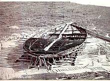 In 1895, with the support of the Ministry of Education, Signor Eliseo Borghi began a systematic study of the wreck site and discovered that the site contained two wrecks instead of the one expected.[3] Among the material Borghi recovered was the bronze tiller head of one of the rudders and many bronze heads of wild animals. Borghi placed all of his finds in his own museum and offered to sell the collection to the Government. The timbers he recovered were discarded and lost while no contextual referencing was documented for any of his finds. Felice Barnabei, director general of the Dept of Antiquity and Fine Art, claimed all of the artefacts for the National Museum and submitted a report requesting the recovery cease due to the "devastation of the two wrecks". An engineer from the Regia Marina (the Italian Royal Navy) surveyed the site to determine the feasibility of recovering the two ships intact. The engineer concluded that the only viable way was to partially drain the lake.[2]