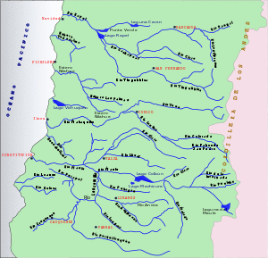A glacier is found on the southern slope,[12] between 1989 and 2017 glacier cover has decreased by over 95% with less than 0.2 square kilometres (0.077 sq mi) of glacier cover remaining.[16] Previous glaciation is also supported by the presence of glacial striations on lava flows and of lahar deposits.[12] The Rio Blanco originates on the southeastern slope of Nevado de Longaví,[2] within the collapse scar. It turns south and west around the volcano in a fishhook pattern. The Estero Martinez and Quebrada Los Bueyes rivers also originate on Nevado de Longaví, on the western and southern flank respectively. They are both tributaries of the Rio Blanco.[7] The Achibueno River also originates on the eastern flank of Nevado de Longaví in a lake of the same name. It flows first northeastward and then turns around the volcano.[17]