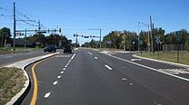 Route 18 then continues through the heavily developed commercial corridor of East Brunswick, intersecting with County Route 617 (Rues Lane) and passing near Brunswick Square Mall. After the interchanges with County Routes 535 (Cranbury Road) and County Route 606 (Milltown Road), Route 18 passes over CSAO's Bonhamtown Industrial Track line and intersects West Ferris Street, West Prospect Street, Tices Lane, and then meets County Route 527 (the Old Bridge Turnpike) at Edgeboro Road. An intersection and partial interchange with Eggers Street and JFK Boulevard is followed by crossing over the New Jersey Turnpike (I-95) at exit 9 of the turnpike. The road then intersects Tower Center Boulevard before crossing into New Brunswick at Lawrence Brook.[3]