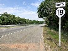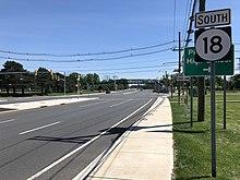 Route 18 is a 42.8-mile-long (68.9 km) state highway in the US state of New Jersey. It begins at an intersection with Route 138 in Wall Township and ends at Interstate 287 (I-287) in Piscataway. Much of the route is a limited-access freeway, including the entire portion in Monmouth County and much of the northern end through New Brunswick and Piscataway. The remainder of the route is a multi-lane divided highway. Route 18 was designated in 1939 as a proposed freeway from Old Bridge to Eatontown.[1] The section west of Old Bridge was formerly designated as part Route S28, a prefixed spur of State Highway Route 28 from Middlesex to Matawan. The designation, assigned in the 1927 renumbering, remained until a second renumbering in 1953. At that point, Route S28 was redesignated as Route 18, though the section from Old Bridge to Matawan was signed as TEMP 18, as this section would be decommissioned when the Route 18 freeway was built.
