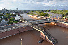 Construction of a new four-lane bridge across the Raritan River (now the John A. Lynch Memorial Bridge) began in the 1960s, but in 1970, when the environment impact laws came out, construction froze with only three massive piers standing out of the river. Outside of the bridge, there was significant controversy over the abandoned Delaware and Raritan Canal heading through New Brunswick. The new freeway was to supplant the former canal and its thirteenth lock in New Brunswick, abandoned in 1932.[15] The environmentalists and the historic preservationists opposed the freeway extension because of the fears of losing the canal, while companies like Johnson & Johnson supported the new highway for redeveloping New Brunswick.[16]