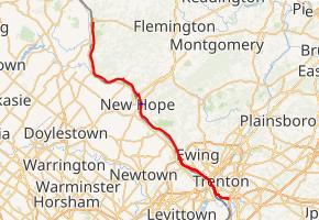 Upon crossing the Delaware and Raritan Canal, Route 29 narrows down to a two-lane undivided road called River Road. It continues along the Delaware River, next to the Delaware and Raritan Canal, which runs between Route 29 and the river. The route intersects the northern terminus of Route 175. Farther north, Route 29 enters Hopewell Township and continues into a more rural setting shaded with trees.[6] Route 29 heads to Washington Crossing State Park, where it intersects County Route 546, which heads east on Washington Crossing-Pennington Road, and the approach to the Washington Crossing Bridge, which continues into Pennsylvania and connects to Pennsylvania Route 532.[1][6] Route 29 continues north along the Delaware River through Titusville, passing by Washington Crossing State Park.[6]
