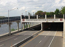 Between 1990 and 1995, the Route 29 freeway was built between the I-195/I-295 interchange and Route 129 in Hamilton Township. A two-lane street, Lamberton Road, connected the two freeway sections. Plans were then made to fill the gap between the two freeway sections in Trenton. Construction began in 1997 on the Route 29 freeway between Route 129 and the Morrisville–Trenton Railroad Bridge. The road was to include two traffic lights at Cass Street and South Warren Street and a tunnel which was to be built as a covered roadway on the bank of the Delaware River.[19] The tunnel was originally scheduled to be complete by 2001 but was delayed after the Army Corps of Engineers discovered many environmental violations that occurred with construction of the tunnel.[20] The roof was put in place in October 2001 and the tunnel officially opened to traffic on March 2, 2002.[21] A restriction to trucks over 13 tons was put in place and made permanent in November 2002.[22]
