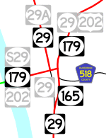 Route 29 crosses into West Amwell Township in Hunterdon County. It enters Lambertville, where Route 29 becomes a four-lane divided highway.[1] At the intersection of South Main Street, Route 29 becomes concurrent with Route 165.[7] The route becomes an undivided highway again and meets the western terminus of County Route 518 (Brunswick Street). It meets Route 179 (Bridge Street), where Route 165 ends and Route 29 turns west for a one-block wrong-way concurrency with the two-lane, undivided Route 179, lasting to the intersection of Main Street, where Route 29 turns north on Main Street.[1][7]