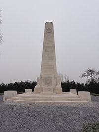 After the war, the New Zealand government instituted four national battlefield memorials to honour the New Zealand soldiers who died on the Western Front.[132] The overwhelming majority of these fatalities, around 12,400, were men from the New Zealand Division.[125] The memorials, designed by Samuel Hurst Seager, are located at Passchendaele, Messines, Le Quesnoy and the Somme. Each memorial includes the words "From the Uttermost Ends of the Earth".[132] In contrast to other Dominions, the names of New Zealand soldiers with no known grave,[133] of which there are about 4,180,[125] are not listed on the Memorials to the Missing at Menin Gate and Thiepval. Instead, it was the policy of the New Zealand government to establish smaller Memorials to the Missing in cemeteries near where the soldiers went missing, one of which is at the Buttes New British Cemetery[133] while another is at the Messines Ridge British Cemetery.[134]