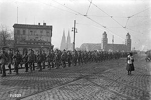 The New Zealand Division was chosen to form part of the Allied occupation force in Germany, to the displeasure of some personnel who had expected to return home.[127] By mid-December it had begun moving through Belgium towards Cologne where it arrived on 20 December.[128][129] Billeted in the city's suburbs, the division remained on active duty when not sightseeing. Educational programs were also implemented. Demobilisation began towards the end of December with the departure of those who had enlisted in 1914 or 1915.[130] The first unit to leave the division was the Pioneer Battalion, and additional men were sent to England on leave. They remained there until transportation to New Zealand could be arranged. Russell had taken ill in late January and departed for the warmer climate of Southern France, leaving the division's artillery commander, Brigadier General G. Johnston, in charge of the division. The artillery was demobilised on 18 March 1919, with the division formally disbanded on 25 March 1919. Its occupation duties were taken up by the British 2nd Division.[131]