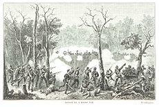 At the peak of hostilities in the 1860s, 18,000 British troops, supported by artillery, cavalry and local militia, battled about 4,000 Māori warriors[8] in what became a gross imbalance of manpower and weaponry.[9] Although outnumbered, the Māori were able to withstand their enemy with techniques that included anti-artillery bunkers and the use of carefully placed pā, or fortified villages, that allowed them to block their enemy's advance and often inflict heavy losses, yet quickly abandon their positions without significant loss. Guerrilla-style tactics were used by both sides in later campaigns, often fought in dense bush. Over the course of the Taranaki and Waikato campaigns, the lives of about 1,800 Māori and 800 Europeans were lost,[5] and total Māori losses over the course of all the wars may have exceeded 2,100.