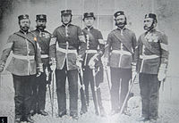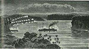 In 1855 just 1,250 Imperial troops, from two under-strength British regiments, were in New Zealand. Although both were scheduled to depart at the end of the year, Browne succeeded in retaining one of them for use in New Plymouth, where settlers feared the spread of intertribal violence.[43] At the outbreak of Taranaki hostilities in 1860, reinforcements were brought from Auckland to boost the New Plymouth garrison, raising the total force of regulars to 450 and for many months the total number of Māori under arms exceeded the number of troops in Taranaki. In mid-April the arrival of three warships and about 400 soldiers from Australia marked the beginning of the escalation of imperial troop numbers.[44]