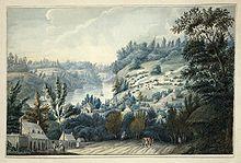The settlement was founded in 1781 as Butlersburg, in honour of Colonel John Butler, the commander of Butler's Rangers. It was later renamed West Niagara to distinguish it from Fort Niagara.[6] It was a British military base and haven for pro-British loyalists fleeing the United States during the volatile aftermath of the American Revolution.[7] Renamed Newark by Lieutenant-Governor John Graves Simcoe in 1792, it was the first capital of Upper Canada (now the province of Ontario). The Upper Canada legislature first met at Navy Hall on September 17, 1792 and met there another four times until June 1796.[7][8] In 1797, Simcoe moved the capital to York because Newark was very close to the border with the U.S. Newark was renamed Niagara in 1798.[6]