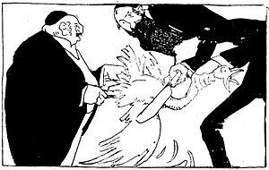 A seminal moment in Iorga's political career took place during the 1907 Romanian Peasants' Revolt, erupting under a Conservative cabinet and repressed with much violence by a National Liberal one. The bloody outcome prompted the historian to author and make public a piece of social critique, the Neamul Românesc pamphlet Dumnezeu să-i ierte ("God Forgive Them").[70] The text, together with his program of agrarian conferences and his subscription lists for the benefit of victims' relatives again made him an adversary of the National Liberals, who referred to Iorga as an instigator.[70] The historian did however struck a chord with Stere, who had been made prefect of Iași County, and who, going against his party's wishes, inaugurated an informal collaboration between Iorga and the Poporanists.[76] The political class as a whole was particularly apprehensive of Iorga's contacts with the Cultural League for the Unity of All Romanians and their common irredentist agenda, which risked undermining relations with the Austrians over Transylvania and Bukovina.[83] However, Iorga's popularity was still increasing, and, carried by this sentiment, he was first elected to Chamber during the elections of that same year.[70][76]