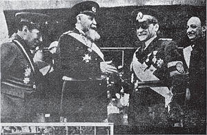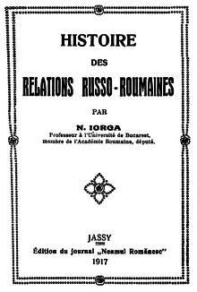 Still a member of Parliament, Iorga joined the authorities in the provisional capital of Iași, but opposed the plans of relocating government out of besieged Moldavia and into the Russian Republic. The argument was made in one of his parliamentary speeches, printed as a pamphlet and circulated among the military: "May the dogs of this world feast on us sooner than to find our happiness, tranquility and prosperity granted by the hostile foreigner."[128] He did however allow some of his notebooks to be stored in Moscow, along with the Romanian Treasure,[129] and sheltered his own family in Odessa.[38]