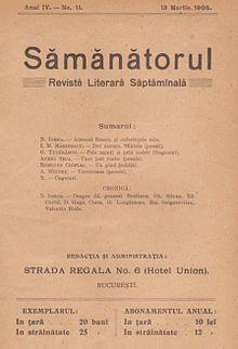 The interval witnessed Iorga's brief affiliation with Junimea, a literary club with conservative leanings, whose informal leader was literary and political theorist Titu Maiorescu. In 1890, literary critic Ștefan Vârgolici and cultural promoter Iacob Negruzzi published Iorga's essay on poet Veronica Micle in the Junimist tribune Convorbiri Literare.[22] Having earlier attended the funeral of writer Ion Creangă, a dissident Junimist and Romanian literature classic, he took a public stand against the defamation of another such figure, the dramatist Ion Luca Caragiale, groundlessly accused of plagiarism by journalist Constantin Al. Ionescu-Caion.[23] He expanded his contribution as an opinion journalist, publishing with some regularity in various local or national periodicals of various leanings, from the socialist Contemporanul and Era Nouă to Bogdan Petriceicu Hasdeu's Revista Nouă.[24] This period saw his debut as a socialist poet (in Contemporanul) and critic (in both Lupta and Literatură și Știință).[25]