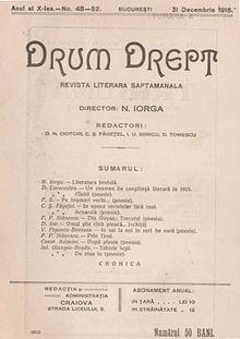 Iorga's interest in the Balkan crisis was illustrated by two of the forty books he put out that year: Istoria statelor balcanice ("The History of Balkan States") and Notele unui istoric cu privire la evenimentele din Balcani ("A Historian's Notes on the Balkan Events").[105] Noted among the others is the study focusing on the early 18th century reign of Wallachian Prince Constantin Brâncoveanu (Viața și domnia lui Constantin vodă Brâncoveanu, "The Life and Rule of Prince Constantin Brâncoveanu").[105] That same year, Iorga issued the first series of his Drum Drept monthly, later merged with the Sămănătorist magazine Ramuri.[105] Iorga managed to publish roughly as many new titles in 1914, the year when he received a Romanian Bene Merenti distinction,[112] and inaugurated the international Institute of South-East European Studies or ISSEE (founded through his efforts), with a lecture on Albanian history.[113]