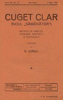 Iorga was by then making known his newly found interest in cultural nationalism and national didacticism, as expressed by him in an open letter to Goga's Budapest-based Luceafărul magazine.[62] After further interventions from Goga and linguist Sextil Pușcariu, Luceafărul became Iorga's main mouthpiece outside Romania.[63] Returning to Bucharest in 1903, Iorga followed Lamprecht's suggestion and focused on writing his first overview of Romanian national history, known in Romanian as Istoria românilor ("The History of the Romanians").[62] He was also involved in a new project of researching the content of archives throughout Moldavia and Wallachia,[62] and, having reassessed the nationalist politics of Junimist poet Mihai Eminescu, helped collect and publish a companion to Eminescu's work.[64]