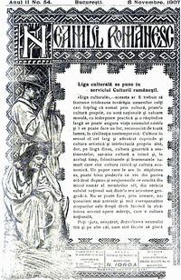 Iorga eventually parted with Sămănătorul in late 1906, moving on to set up his own tribune, Neamul Românesc. The schism was allegedly a direct result of his conflicts with other literary venues,[70] and inaugurated a brief collaboration between Iorga and Făt Frumos journalist Emil Gârleanu.[79] The newer magazine, illustrated with idealized portraits of the Romanian peasant,[80] was widely popular with Romania's rural intelligentsia (among which it was freely distributed), promoting antisemitic theories and raising opprobrium from the authorities and the urban-oriented press.[73]