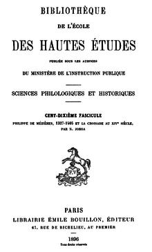 Having received the scholarship early in the year, he made his first study trips to Italy (April and June 1890), and subsequently left for a longer stay in France, enlisting at the École pratique des hautes études.[20] He was a contributor for the Encyclopédie française, personally recommended there by Slavist Louis Léger.[20] Reflecting back on this time, he stated: "I never had as much time at my disposal, as much freedom of spirit, as much joy of learning from those great figures of mankind ... than back then, in that summer of 1890".[30] While preparing for his second diploma, Iorga also pursued his interest in philology, learning English, German, and rudiments of other Germanic languages.[31] In 1892, he was in England and in Italy, researching historical sources for his French-language thesis on Philippe de Mézières, a Frenchman in the Crusade of 1365.[31] In tandem, he became a contributor to Revue Historique, a leading French academic journal.[31]