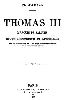 Somewhat dissatisfied with French education,[32] Iorga presented his dissertation and, in 1893, left for the German Empire, attempting to enlist in the University of Berlin's Ph.D. program. His working paper, on Thomas III of Saluzzo, was not received, because Iorga had not spent three years in training, as required. As an alternative, he gave formal pledge that the paper in question was entirely his own work, but his statement was invalidated by technicality: Iorga's work had been redacted by a more proficient speaker of German, whose intervention did not touch the substance of Iorga's research.[31] The ensuing controversy led him to apply for a University of Leipzig Ph.D.: his text, once reviewed by a commission grouping three prominent German scholars (Adolf Birch-Hirschfeld, Karl Gotthard Lamprecht, Charles Wachsmuth), earned him the needed diploma in August.[33] On 25 July, Iorga had also received his École pratique diploma for the earlier work on de Mézières, following its review by Gaston Paris and Charles Bémont.[31] He spent his time further investigating the historical sources, at archives in Berlin, Leipzig and Dresden.[34] Between 1890 and the end of 1893, he had published three works: his debut in poetry (Poezii, "Poems"), the first volume of Schițe din literatura română ("Sketches on Romanian Literature", 1893; second volume 1894), and his Leipzig thesis, printed in Paris as Thomas III, marquis de Saluces. Étude historique et littéraire ("Thomas, Margrave of Saluzzo. Historical and Literary Study").[35]