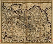 Nicolaes Witsen was born in Amsterdam, the son of Cornelis Jan Witsen, burgomaster, head bailiff and administrator of the Dutch West India Company. In 1656 Nicolaes went with his father to England, where he was introduced to Oliver Cromwell's children.[2] In March 1662 Nicolaes Witsen held a disputation at the Amsterdam Athenaeum Illustre, in which he argued against the influence of comets on the welfare of all earthly things, possibly influenced by his nephew Joannes Hudde. In 1664 and 1665 Nicolaes made an embassy to Moscovia with the envoy Jacob Boreel. By boat, they went to Riga, then Swedish, and overland to Novgorod and Moscow. There he met with Andrew Vinius, who became his life long friend, sending him maps and objects. The talks with czar Alexis of Russia about a monopoly on tar were no success. Witsen wrote in his diary that no-one there was occupied with art or science. Witsen visited the Patriarch Nikon and made notes on the worship of icons, interested in his name saint (and patron saint of Amsterdam), saint Nicholas. He studied law at Leiden University, but became more interested in languages and maps. In the 1666–1667 Witsen travelled to Rome and met with Cosimo III de' Medici in Pisa. In Paris, he met the scientist Melchisédech Thévenot.[3] In 1668 he travelled to Oxford. In 1674 he married Catherina Hochepied. Four children were born, not surviving childhood.