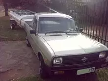 The B120 commercial truck debuted in February 1971, based on the B110 passenger car chassis. The B120 used the same wheelbase and running gear of the Datsun 1200 sedans, coupé and wagon models. Initially it used the same stainless steel grille as the 1200 sedan, and the rectangular gauges of the Standard model B110s. Both regular (B120) and long-bed (GB120) models were offered. After the 1200 car series ceased production the B120 continued. In certain markets such as South Africa, the B120 was actually badged as the "120Y" and sold as part of the updated 120Y range.[16] The It was assembled locally and marketed in New Zealand during the 1980s in two trims: "RoadStar" and "SportStar". It was capable of 49 mpg‑US (4.8 L/100 km; 59 mpg‑imp). B120s were not sold in North America, partly due to the US "Chicken Tax" and partly because perceptions of vehicle size meant that the 620/720 series were considered small pickups.