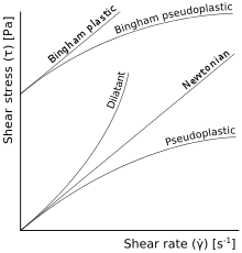 | Shear thinning (pseudoplastic) | Apparent viscosity decreases with increased stress[4][5] | Nail polish, whipped cream, ketchup, molasses, syrups, paper pulp in water, latex paint, ice, blood, some silicone oils, some silicone coatings, sand in water | |