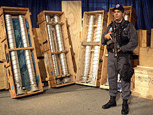 Israel is also thought to possess an arsenal of potentially up to several hundred nuclear warheads based on estimates of the amount of fissile material produced by Israel.[45] This has never been openly confirmed or denied however, due to Israel's policy of deliberate ambiguity.[46]