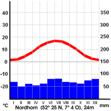 Nordhorn lies in the Mid-European Temperate Zone. The average yearly temperature is 8.5 °C (47 °F), the mean air pressure is 761.5 hPa and the mean yearly precipitation amounts to between 700 and 800 mm (28 and 31 in). The climate is Subatlantic with rather mild winters and fairly warm summers.