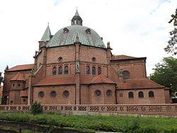 In imitation of the Late Romanesque churches in neighbouring Westphalia, churches were built in the 13th century out of Bentheim sandstone. The only artwork preserved from this time is the baptismal font in Brandlecht. Bearing witness to the 15th century is the Alte Kirche ("Old Church") at the market. It was built in the Late Gothic style under Dutch influence and to honour Saint Ludger, who founded the town's first church, and in whose name this newer church was consecrated. It is likely that three generations worked on this impressive three-naved hall church. Originally, the tower was 102 m tall and fell under town council's stewardship as a watchtower and firetower. A violent storm toppled the steeple, which came down in the marketplace before the building. The new steeple was considerably shorter – about 70 m – and was designed to let wind pass through it. During restoration work inside the church in 1967, some paintings were uncovered in the sanctuary, the Nordhorner Apostelbilder ("Nordhorn Apostle Pictures"). They show the Twelve Apostles and various Biblical scenes. The paintings were preserved because it could not be agreed what should be done with them, since the Calvinist Church order of the Reformed Creed introduced by Count Arnold II at Bentheim in 1588 forbade pictures and adornment in church rooms. During more restoration work in the late 1990s, these pictures were rediscovered, and the church council decided to cover the pictures over with rice paper, as they seemed too valuable simply to paint over.