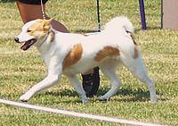 The Norrbottenspets is a small to medium sized, compact and robust breed with typical spitz features.[4] Slightly smaller than the Finnish Spitz, the breed standard states dogs should stand between 43 and 47 centimetres (17 and 19 in) with bitches being slightly smaller, standing between 40 and 44 centimetres (16 and 17 in); they typically weigh between 11 and 15 kilograms (24 and 33 lb).[1][2][5] The breed has a thick, dense double coat that protects the breed well during arctic winters; the outer coat is hard, short and straight whilst the undercoat is fine and dense.[4] The breed can be seen in all colours, although white with red, yellow, cream, tan or black markings is most common; the breed standard states they should be white with either yellow or red patches.[1][4][5] The breed has a wedge-shaped head with erect ears; their body is strong and is as long as it is tall with a deep chest; their tail is long and is carried high, curled over their back is typical of spitz dogs.[4]