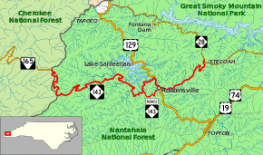 North Carolina Highway 143 (NC 143) is a primary state highway in the U.S. state of North Carolina. It runs from the Tennessee state line to NC 28, near the community of Stecoah. It is best known for its 18-mile (29 km) section of the Cherohala Skyway, shared with Tennessee State Route 165.