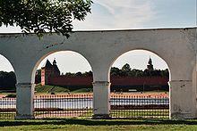 The city is known for the variety and age of its medieval monuments. The foremost among these is the St. Sophia Cathedral, built between 1045 and 1050 under the patronage of Vladimir Yaroslavich, the son of Yaroslav the Wise; Vladimir and his mother, Anna Porphyrogenita, are buried in the cathedral.[37] It is one of the best preserved churches from the 11th century. It is also probably the oldest structure still in use in Russia and the first one to represent original features of Russian architecture (austere stone walls, five helmet-like domes). Its frescoes were painted in the 12th century originally on the orders of Bishop Nikita (died 1108) (the "porches" or side chapels were painted in 1144 under Archbishop Nifont) and renovated several times over the centuries, most recently in the nineteenth century.[38] The cathedral features famous bronze gates, which now hang in the west entrance, allegedly made in Magdeburg in 1156 (other sources see them originating from Płock in Poland) and reportedly snatched by Novgorodians from the Swedish town of Sigtuna in 1187. More recent scholarship has determined that the gates were most likely purchased in the mid-15th century, apparently at the behest of Archbishop Euthymius II (1429–1458), a lover of Western art and architectural styles.[39]