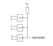 With active low open collector logic outputs, as used for control signals in many circuits, an OR function can be produced by wiring together several outputs. This arrangement is called a wired OR. This implementation of an OR function typically is also found in integrated circuits of N or P-type only transistor processes.