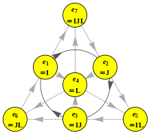 A convenient mnemonic for remembering the products of unit octonions is given by the diagram, which represents the multiplication table of Cayley and Graves.[4][9] This diagram with seven points and seven lines (the circle through 1, 2, and 3 is considered a line) is called the Fano plane. The lines are directional. The seven points correspond to the seven standard basis elements of Im(O) (see definition below). Each pair of distinct points lies on a unique line and each line runs through exactly three points.