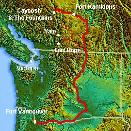 The Okanagan Trail was an inland route to the Fraser Canyon Gold Rush from the Lower Columbia region of the Washington and Oregon Territories in 1858–1859. The route was essentially the same as that used by the Hudson's Bay Company fur brigades, following the Columbia River to the confluence of the Okanogan River, and then up that river's watercourse via Osoyoos, Skaha (Dog) and Okanagan Lakes, then using a pass via Monte Creek to Fort Kamloops, at the confluence of the North and South Thompson Rivers. The route then went west from there down the Thompson River either to the lower gold-bearing bars of the Fraser River between what is now Lytton, British Columbia and Yale, British Columbia, or via Hat Creek and Marble Canyon to the upper Fraser goldfields around present-day Lillooet, British Columbia. A shorter branch-route to the lower Thompson and lower Fraser Canyon diverged from the main route at the confluence of the Similkameen River and the Okanogan (at present-day Oroville, Washington). Cayoosh and The Fountains are today's Lillooet, British Columbia and environs.
