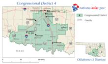 Oklahoma's 4th congressional district is located in south-central Oklahoma and covers (in whole or in part) a total of 15 counties. Its principal cities include Midwest City, Norman, Moore, Ada, Duncan, Lawton/Ft. Sill, and Ardmore. The district also includes much of southern Oklahoma City.