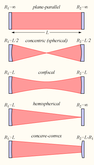 For a resonator with two mirrors with radii of curvature R1 and R2, there are a number of common cavity configurations. If the two radii are equal to half the cavity length (R1 = R2 = L / 2), a concentric or spherical resonator results. This type of cavity produces a diffraction-limited beam waist in the centre of the cavity, with large beam diameters at the mirrors, filling the whole mirror aperture. Similar to this is the hemispherical cavity, with one plane mirror and one mirror of radius equal to the cavity length.